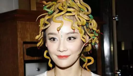 袁姗姗的头饰可谓是超级吓人,估计小孩子都会吓哭。据说袁珊珊头顶70多头假蛇,真是又惊悚又恶心。甚至还有不少网友调侃:满满一头蛆。